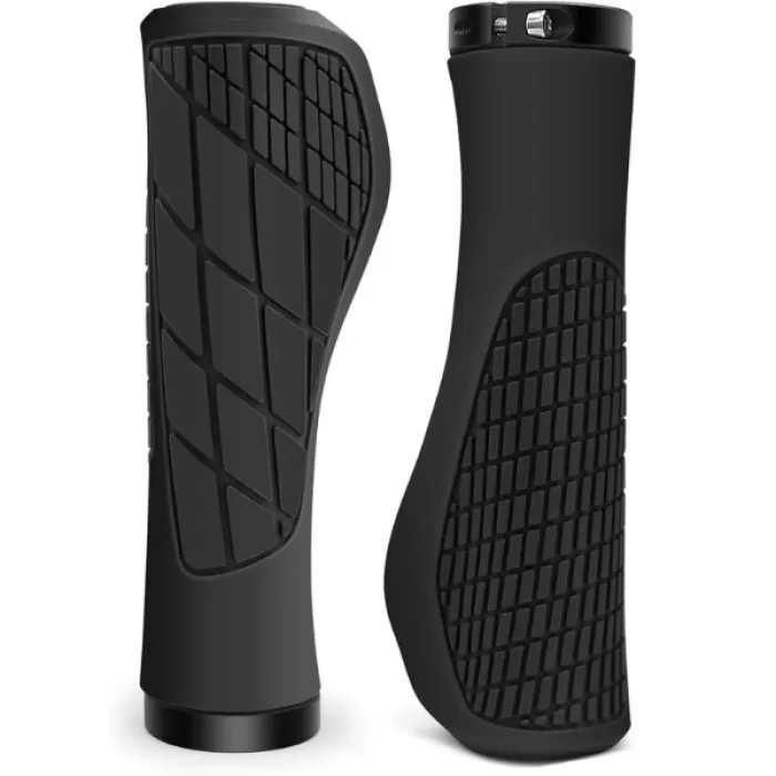 Puños ergonómicos con relieve y sistema de abrazadera para una sujeción firme y cómoda en el manillar.